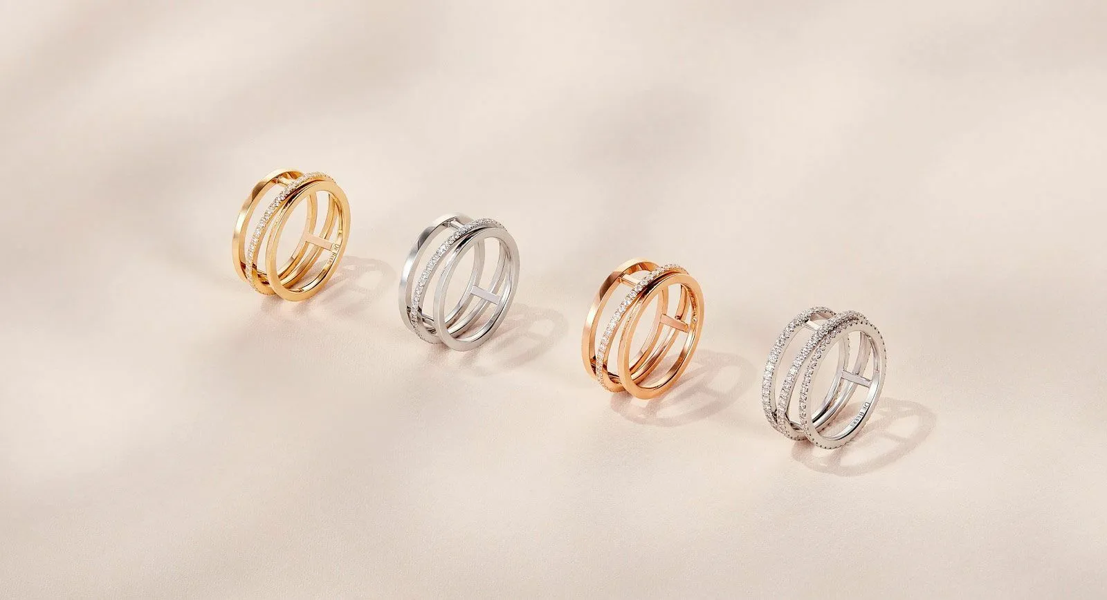 De Beers’ new ‘Horizon’ collection features two parallel bands, held apart by three gold concave pillars. They also support a band set with 46 micropavé diamonds, which is able to oscillate and orbit between the ring above and below it. This futuristic collection has been crafted in rose, white or yellow gold and its name is derived from the inspiration behind this innovative design: the horizon line. The word ‘horizon’ comes from the Greek word – horizõn kyklos – that stands for ‘separating circle’.