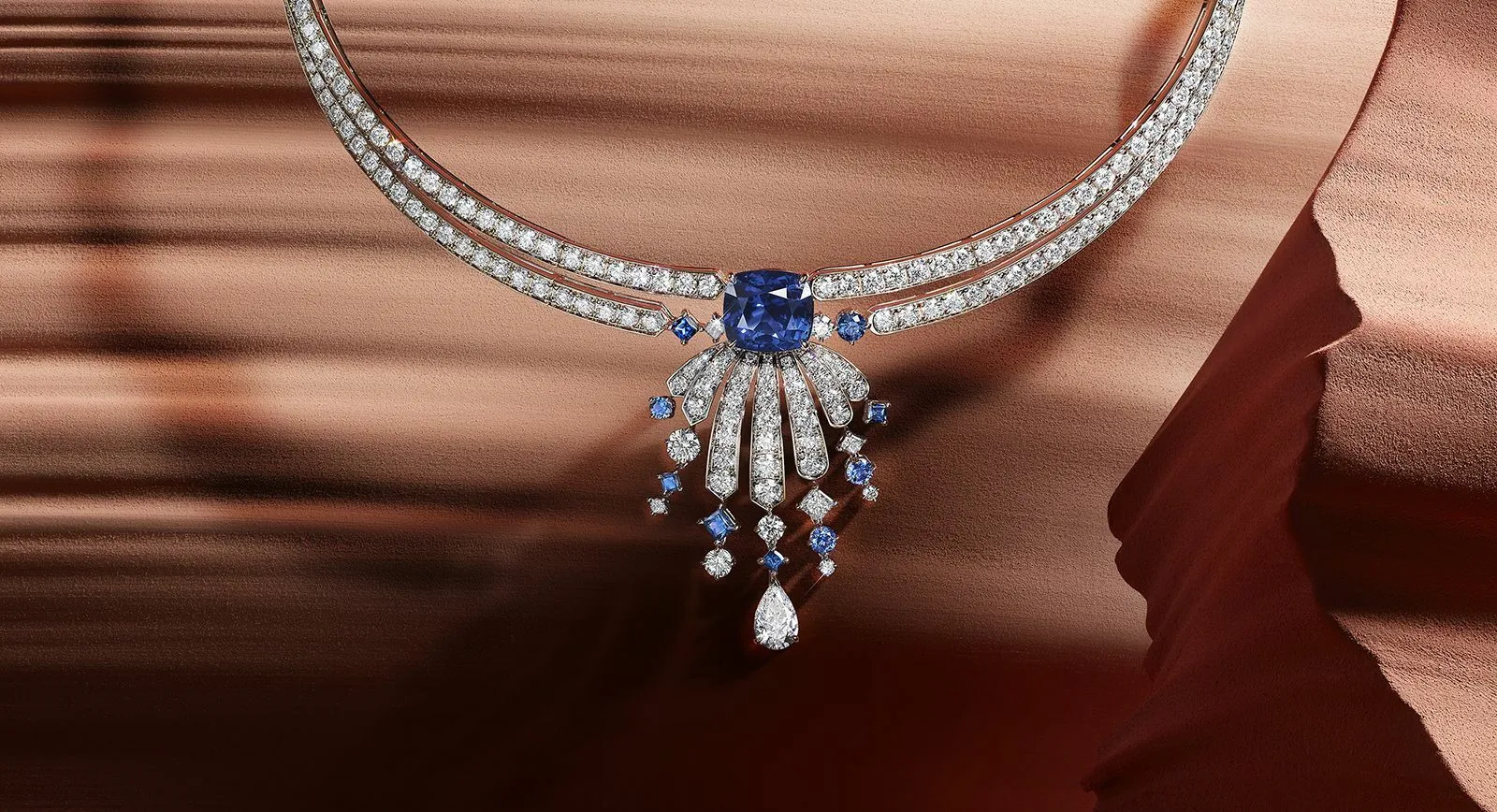 Dehres necklace and ring with heart cut sapphires and diamonds