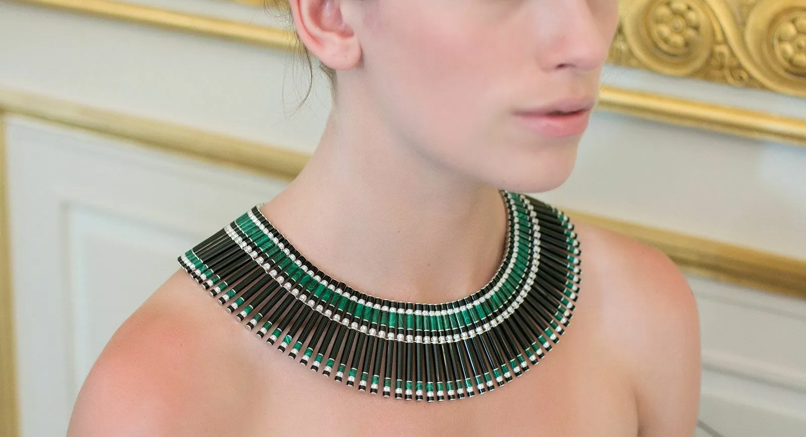 Now imagine before you, readers, a silk tassel which has been unfolded in a long single line. The fringed thread you hold in your hands is that which forms the basis for the design of the stunning Cartier ‘Alya’ necklace with 107.69 carats of Mozambican rubies, as well as tourmalines, amazonites, onyx and diamonds. Similarly, this fringed motif is translated in De Beers ‘Chapman’s Zebra’ necklace with diamonds and black pearl, as well as the Boucheron ‘Grosgrain’ malachite, onyx and diamonds piece, and the Chanel’s ‘Ble Gabrielle’ necklace created with textured white and yellow gold with diamonds. The approach of the first three brands makes use of a fringe with a repeating pattern, which bends around the entire circumference of the neck. In the latter brand, the fringe is used to embolden the design’s frontal foliage.