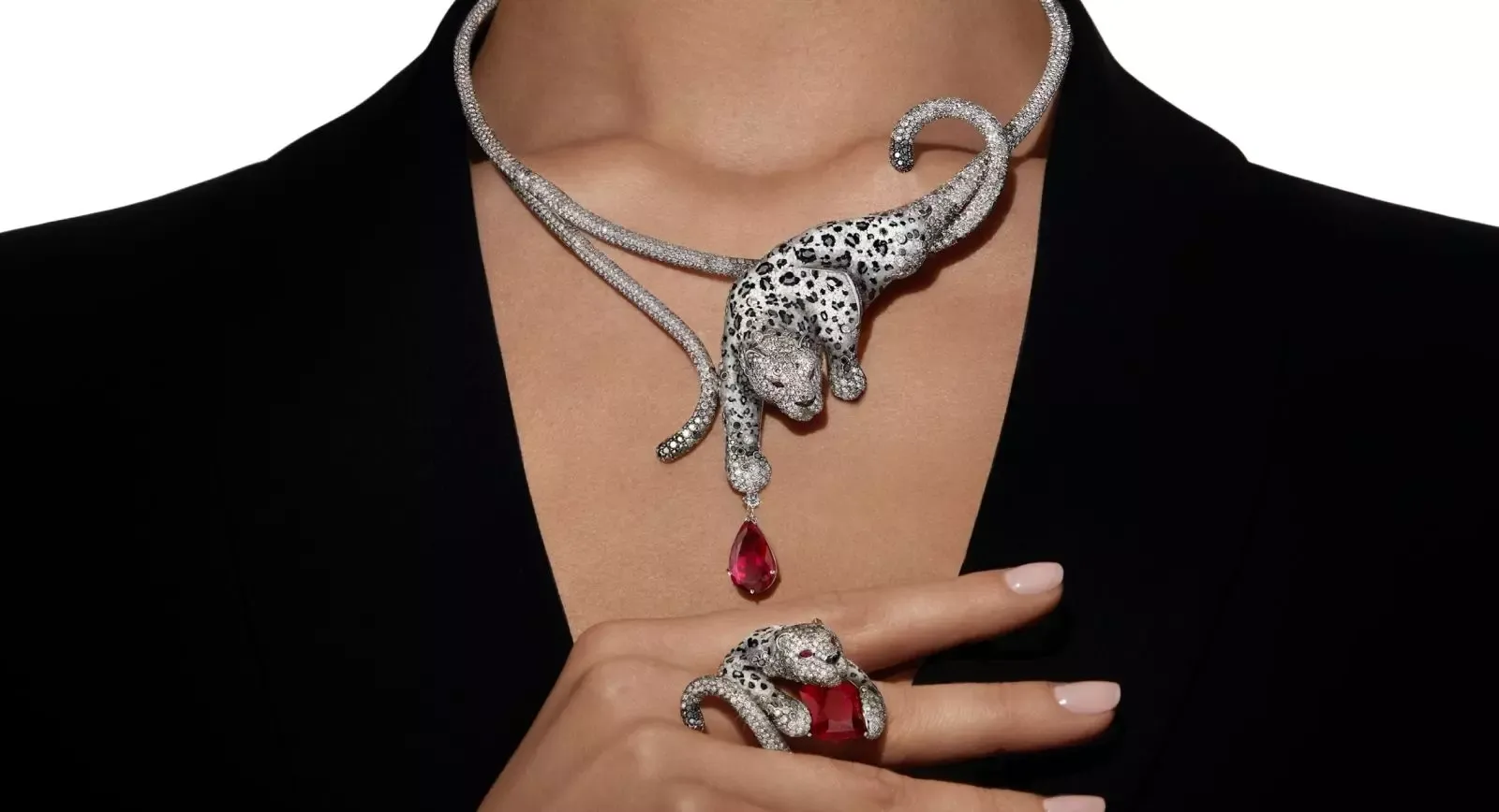 Finally, I must mention the Damisa Ice set, which is a re-edition of an iconic piece from the Sicis archives. Here we see the big cat motif interpreted through micromosaic with its three-dimensional body covered in leopard spots of white, black and grey. This is punctuated with bezel-set and pavé colourless and black diamonds extending around the neck and down the cat’s tail in a subtle graduation from white to grey to black. The highlight of the necklace, however, is a beautiful pear-shaped rubellite drop, which adds a pop of colour and draws attention to the leopard’s marquise-shaped red gemstone eyes. The matching ring is equally striking, this time with an octagonal-shaped rubellite between the feline’s claws.