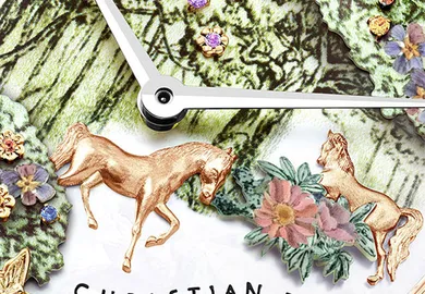 Framed by twisted plaits composed of gold and diamonds, the elegant buttons that hide the time are quintessential Chanel: a bisected Australian pearl, a carved golden lion, a diamond camellia, a Byzantine motif, an agate camellia and an agate cameo of Gabrielle Chanel in profile. Meanwhile, each white gold watch face glistens with 142 diamonds. The “cuff” is not only inspired by tweed but actually crafted from the iconic fabric in five of the seven models, which are all powered by a high-precision quartz movement.