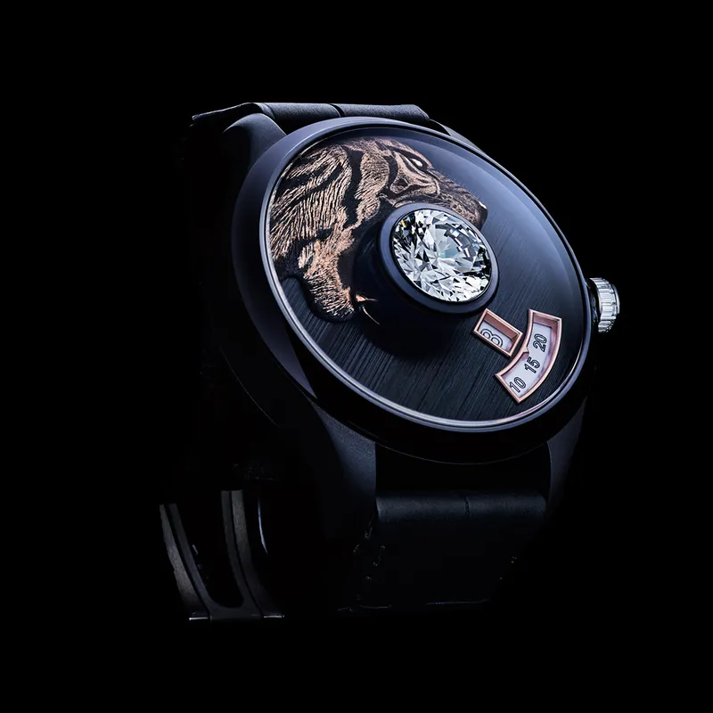 The founders of the French brand de Tournemire specialise in the art of jewellery making, something which they have decided to interweave into a line of watches. The watch brand offers a discerning public models with colourless round diamonds weighing no less than five carats, set in the very centre of a 44-millimetre dial. Its decoration is normally built around the central stone, like in the models with a tiger engraved in rose gold with a diamond in its teeth.