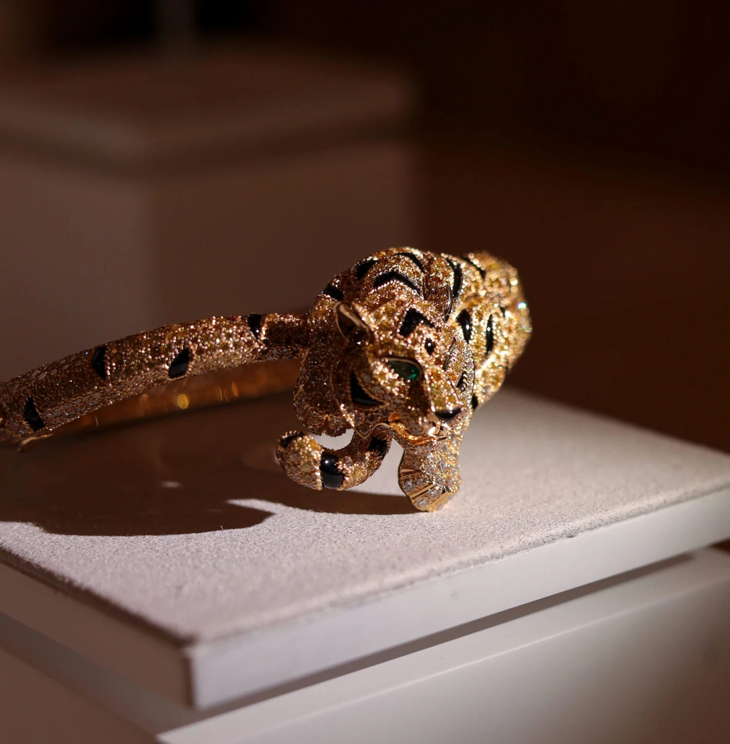Finally, Cartier has added another necklace to Nature Sauvage Chapter III, describing it as the Tiger Fine Jewellery necklace. Perhaps this means it does not perceive this piece to be in the same category of high jewellery? Regardless, it is a striking collar crafted with yellow, orange, brown and white diamonds, onyx inlay and emeralds to bring a prowling tiger to life. Its front paw, which sits just below the tiger’s face, is articulated for an added touch of realism.