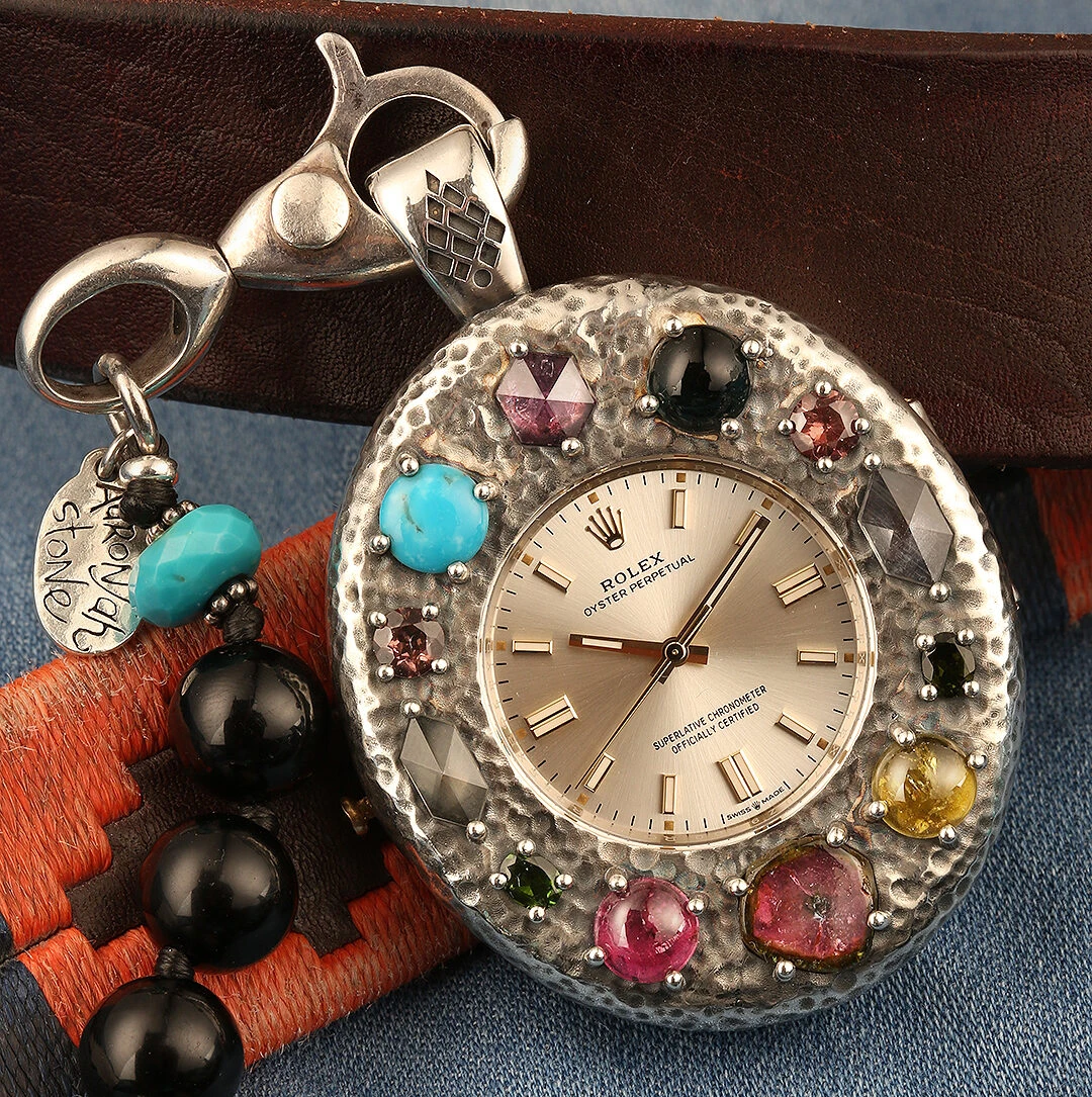Luxury jewellery and watchmaking have long intersected, but a new trend is bringing the two crafts closer than ever as jewellery designers set themselves the challenge of embellishing timepieces with their distinctive artistic signatures. Take Jacquie Aiche, for example, whose journey to customised watches began with her own vintage timepiece. "I had the vision to recreate the face [of the watch] with our signature Tribe Eye," says Aiche, referring to her take on the classic evil eye motif, which she often uses in her jewellery collections, usually set with diamonds. "It became something beyond what I ever imagined." After sharing her work, the reaction from her fan base was instantly enthusiastic. Aiche started exploring the idea further by giving vintage Rolex watches the Jacquie Aiche treatment, adding illustrations of evil eyes or mythical thunderbirds to the dials, or introducing gemstone indices.