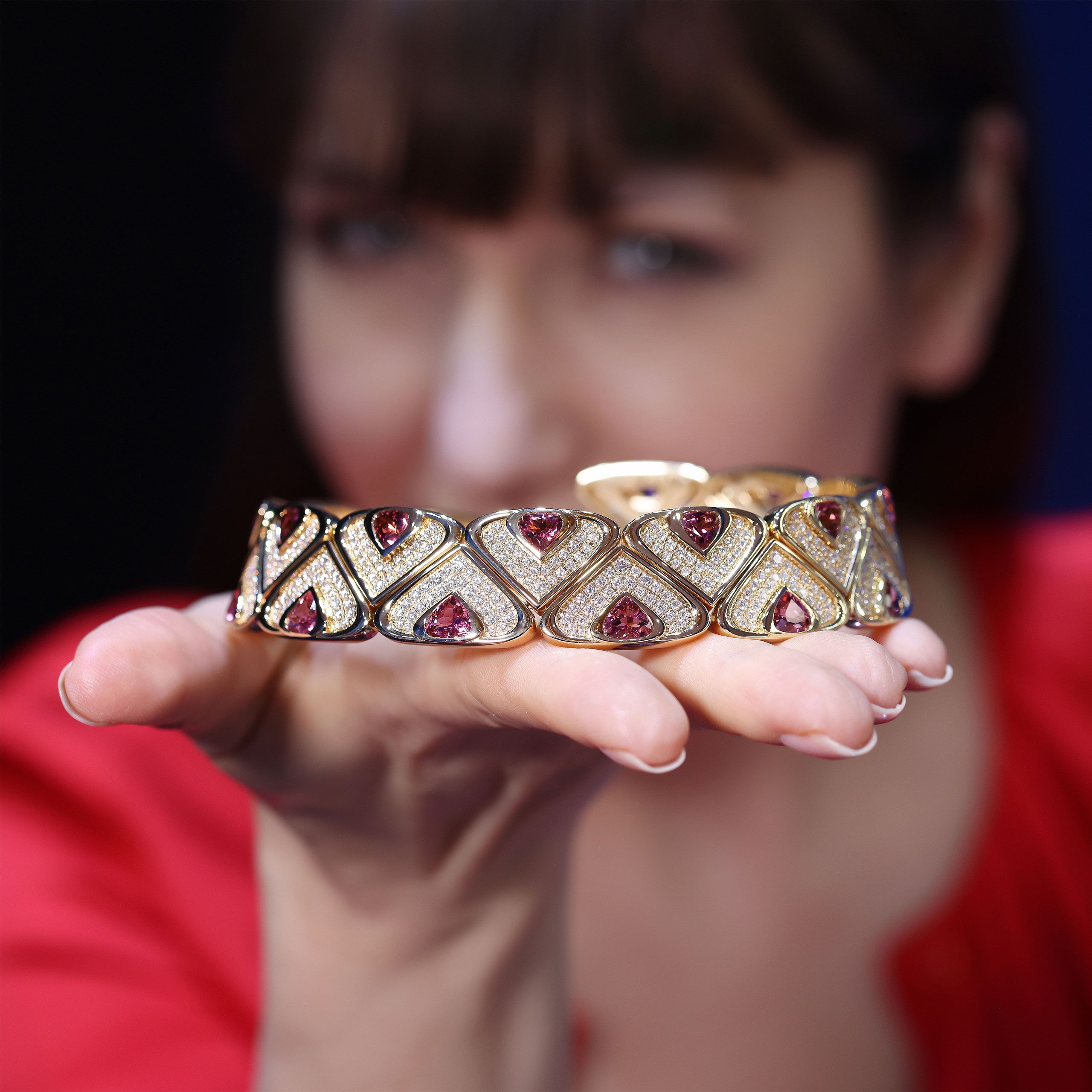 Showcasing Marina B’s signature bold geometry, Katerina holds the Irreversible high jewellery necklace, set with pink tourmalines and diamonds in 18k yellow gold