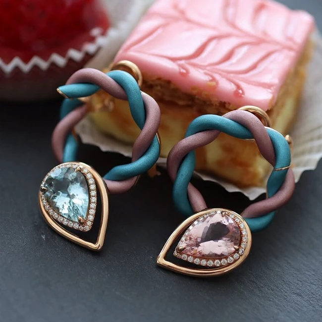 Katerina Perez wears the Mayiana Amour Pastel earrings (left) with a 3.09 carat pear-shaped morganite, a 2.96 carat pear-shaped aquamarine and diamonds set in 18k rose gold and pink and blue aluminium, shown here alongside the matching ring and bracelet