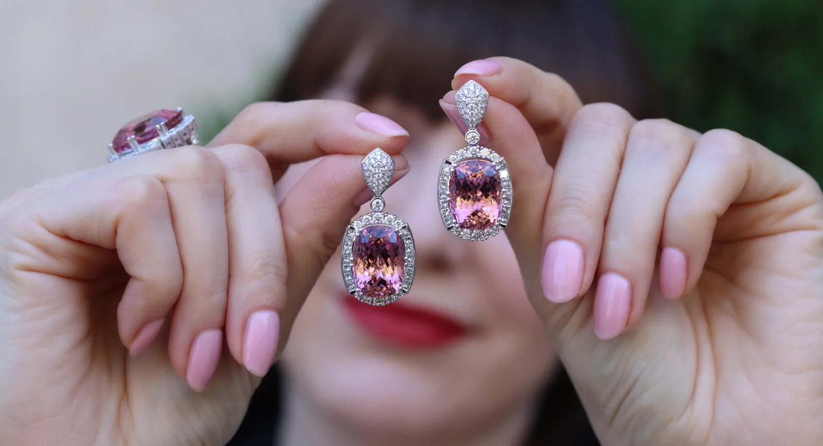 Katerina Perez wears the Sunita Nahata Blush collection ring with a 23.13 carat cushion-cut pink tourmaline and the matching earrings with 35.67 carats of pink tourmalines, both with princess- and round-cut diamonds in 18k white gold