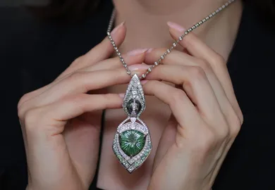 Next, there’s a suite of sidewinder snakes in textured 18k yellow gold, including earrings and a striking pendant that appear to slither across the skin. Another design that captures the ambitious size and scale of Nathalie’s creations is the Thorn necklace with highly polished barbs of yellow gold around trillion-cut peridot gemstones. The item took more than six months to produce due to the challenges of sourcing perfectly matching gems and crafting each element so it is comfortable (and safe!) to wear.